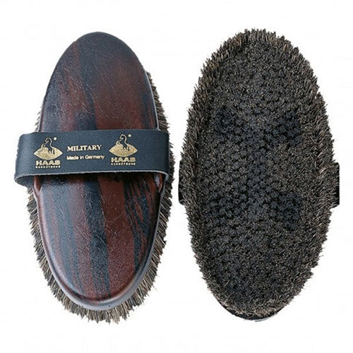Strong horsehair mixture used – shorter bristles in the centre surrounded by longer bristles to get into the coat and flick out dirt and dust. Leather hand strap.